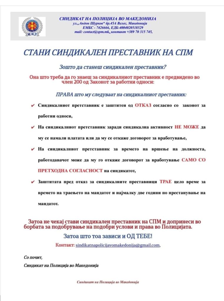 Facebook Instagram YouTube Facebook Одржан е работен состанок со раководството на Единицата за брзо распоредување (ЕБР) Одржан состанок со раководството на ЕИП – Единица за интервентна полиција Реакција на СПМ ПОКАНА ЗА УЧЕСТВО НА I СПОРТСКИ ИГРИ НА СПМ Барање за утврдување на вредноста на бод во полицијата, 1 ЕВРО – 1 БОД да стане стварност П О В О Л Н О С Т за членовите на Синдикат на Полиција во Македонија МПС НЕ СМЕЕ ДА НАПРАВИ ОТСТАПКИ ЗА ПЛАТАТА ВО МВР- Секој работник во МВР треба ова да го знае !! Кратко интервју со претседателот на Синдикатот на полиција во Македонија, Орце Коцевски даден за порталот РаботникМК Кратко интервју со претседателот на Синдикатот на полиција во Македонија, Орце Коцевски Нема бегање од вистината – повисоки плати ќе има, колку ќе биде тоа зависи исклучиво од способноста/неспособноста на МПС‼️ За СПМ Како да станам член? ОТЧЕТ 2020-2025 Одржан е работен состанок со раководството на Единицата за брзо распоредување (ЕБР) Одржан состанок со раководството на ЕИП – Единица за интервентна полиција Реакција на СПМ