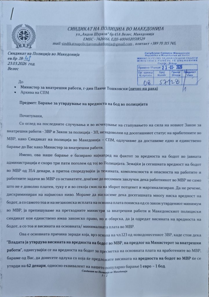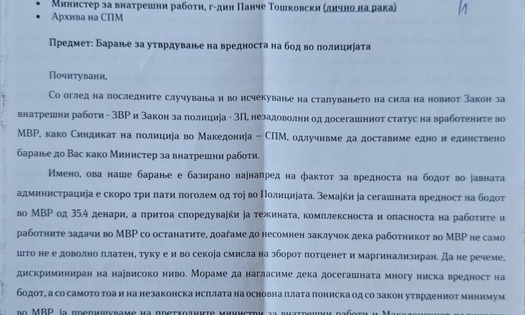 Со оглед на последните случувања и во исчекување на стапувањето на сила на новиот Закон за внатрешни работи – ЗВР и Закон за полиција – ЗП, незадоволни од досегашниот статус на вработените во МВР, како Синдикат на полиција во Македонија – СПМ, доставуваме барање за утврдување на вредноста на бод во полицијата.
