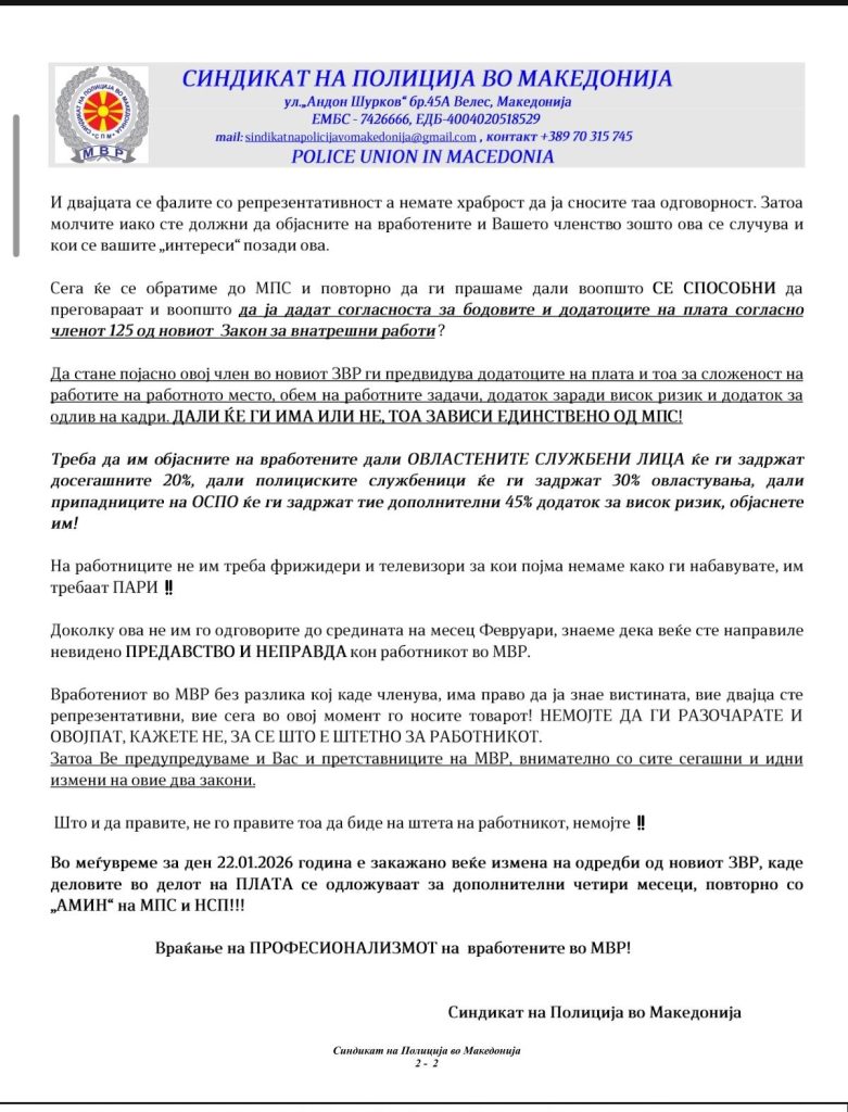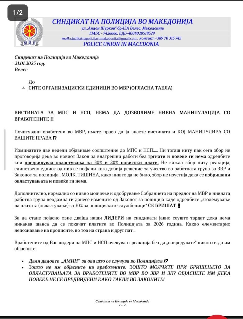 Од денес нема бегање од вистината, ги повикуваме сите вработени во МВР да не потпаѓаат на лажни информации и манипулирања на еден од синдикатите во МВР![]()