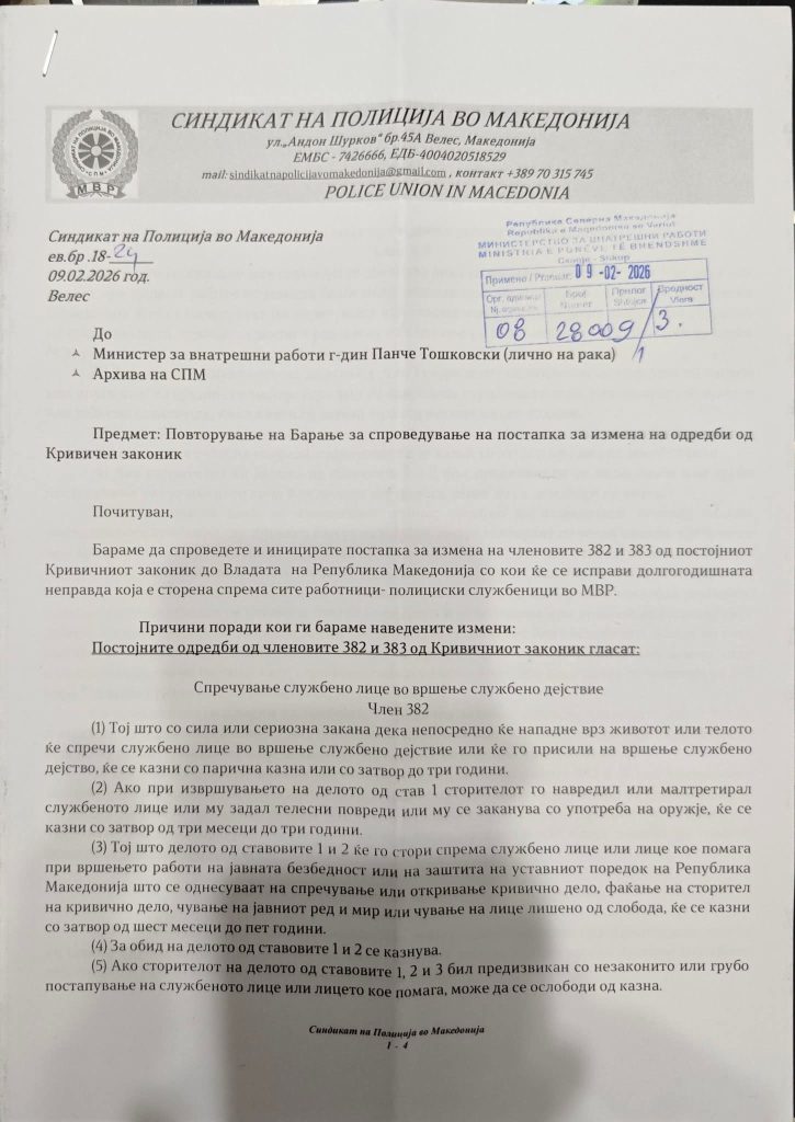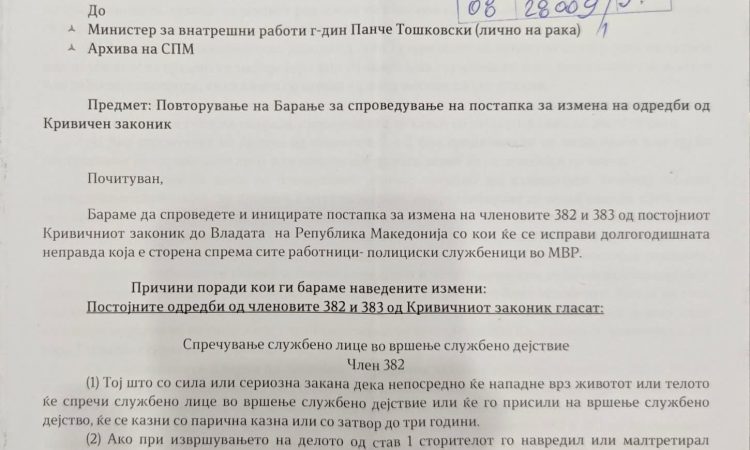 Поднесено барање до Министерство за внатрешни работи / Мinistria e Punëve të Brendshme за измени на членовите 382 и 383 од Кривичниот Законик и тоа кривичните дела “Спречување и напад на овластено службено лице”