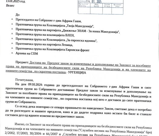 Синдикат на Полиција во Македонија – СПМ до сите пратенички групи во Собранието на Република Македонија повторно достави Предлог закон за изменување и дополнување на Законот за посебните права на припадниците на безбедносните сили на Република Македонија и на членовите на нивните семејства